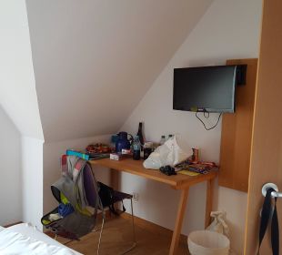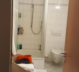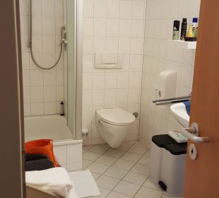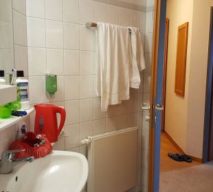 Stuhl. Das Bad war mit Dusche, WC und Sparsamen Ablagen sehr ordentlich.